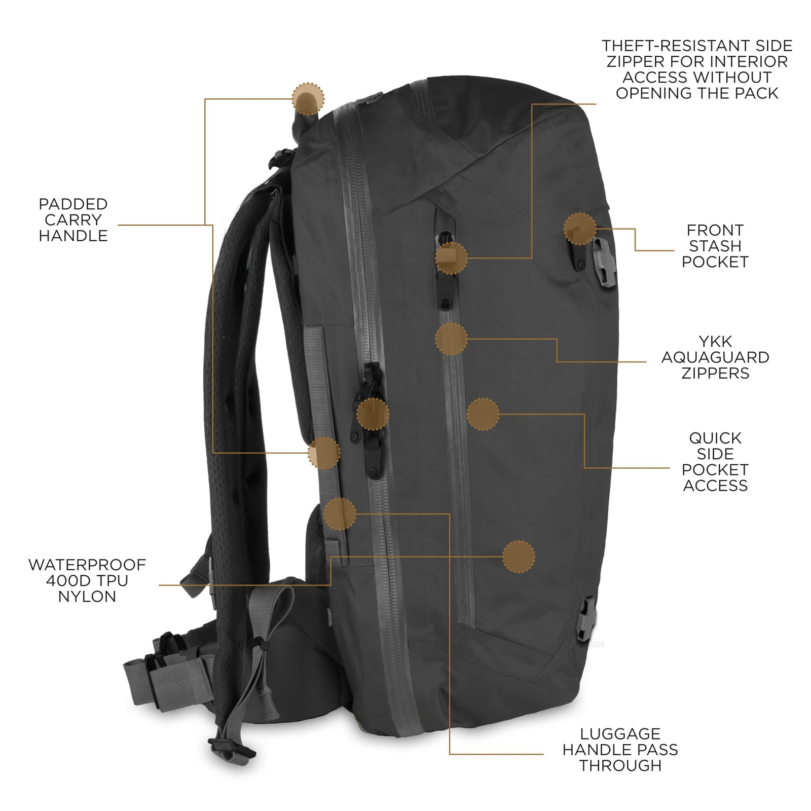 - Made from 400D waterproof TPU-coated nylon with DWR finish.