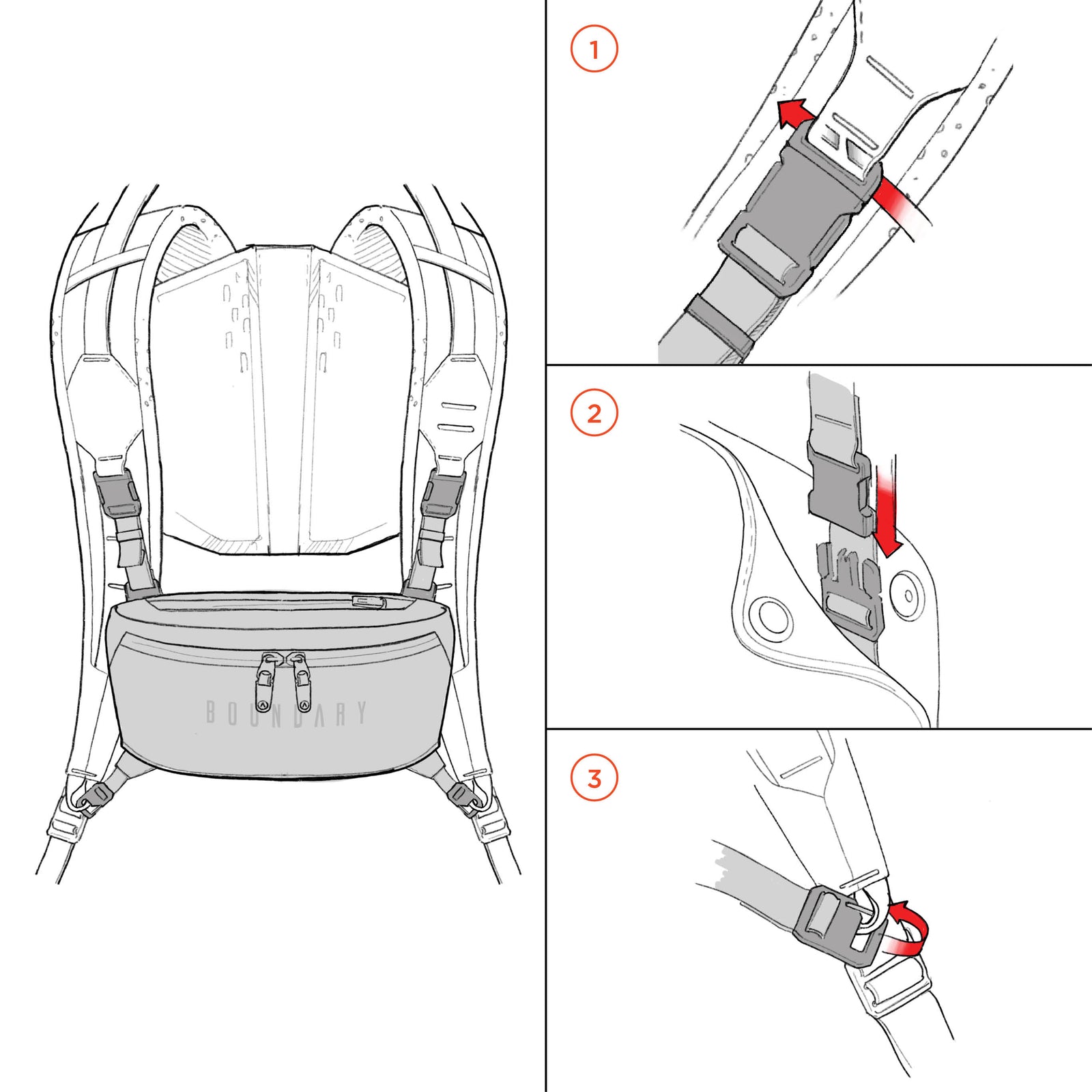 Slide strap buckle onto Arris Pack harness