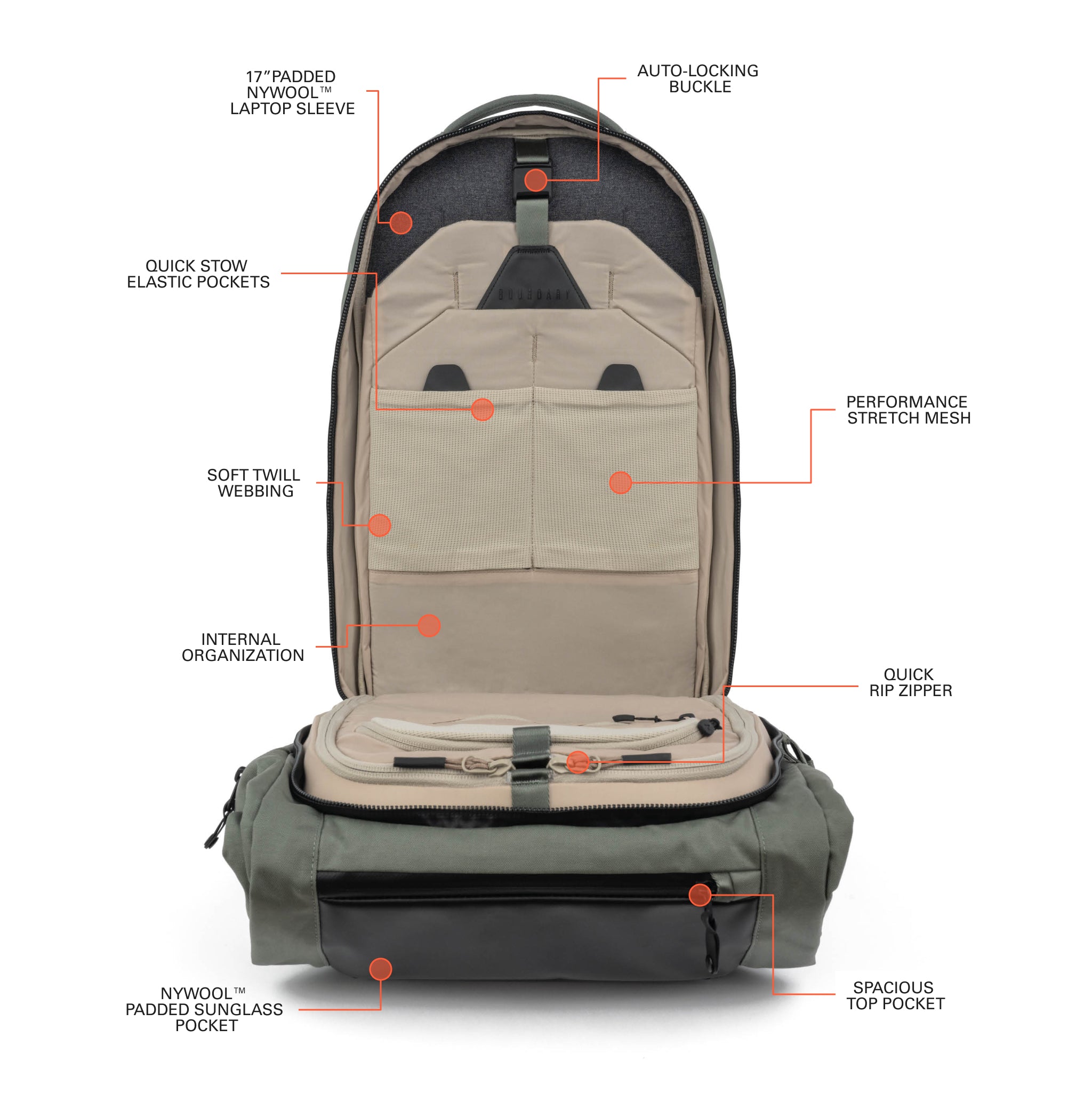 Full clamshell main compartment with water-resistant zipper